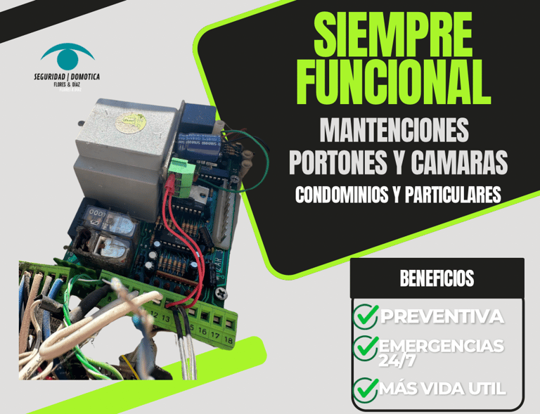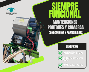 Ofrecemos planes de mantención preventiva y correctiva para portones automáticos y sistemas de cámaras de seguridad en casas y condominios. Revisamos motores, tarjetas electrónicas, fotoceldas, balizas y controles de acceso, además de la limpieza y ajuste de cámaras y cableado.